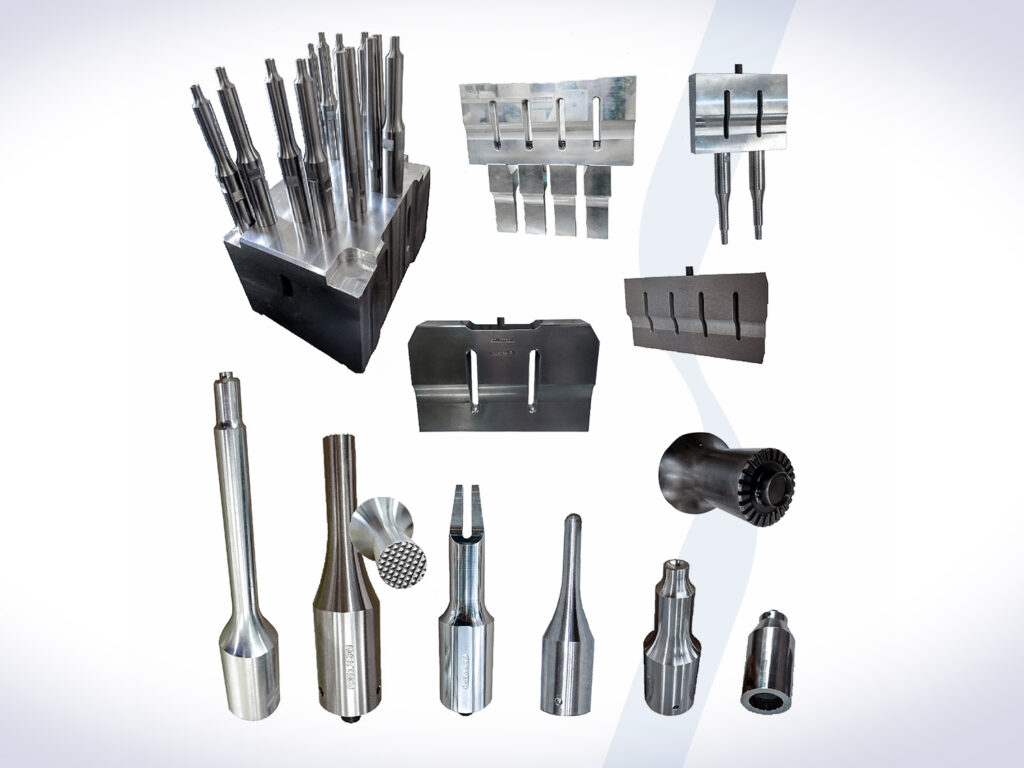 O sonotrodo é a ferramenta que encosta na peça. Deve ressonar corretamente, distribuir amplitude e resistir ao desgaste. Materiais comuns: alumínio (leve, bom para 20 kHz), titânio (resistente ao desgaste, bom para muitas operações), e aço (para corte/selagem em têxteis e quando há abrasão). A face ativa pode reproduzir contornos da peça e pode incluir texturas (knurl) para grip controlado. Boas práticas: